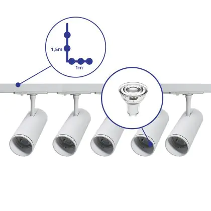 Complete Set 1-Phase Rail L 1 x 1,5 Meter White | incl. 5x Spot + GU10 2700K 3W Dimmable + End Cap, Power Connector and L -Connector