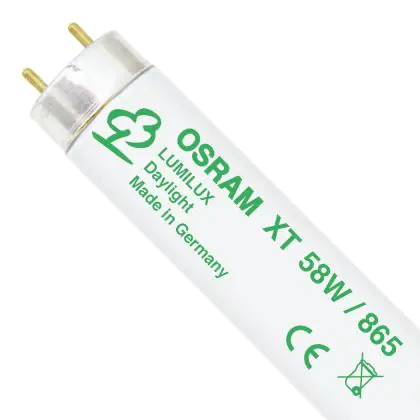 The Osram T8 L 58W/865 XT G13 Daylight are fluorescent tubes endowed with a 58W power output and with a G13 socket. Their length measures 150cm. The average life span of these products are incredibly long, 50000 hours on average. Their rendering colour is set between 80Ra and 89Ra. With a colour temperature of 6500K, these tubes assure a "daylight" effect.